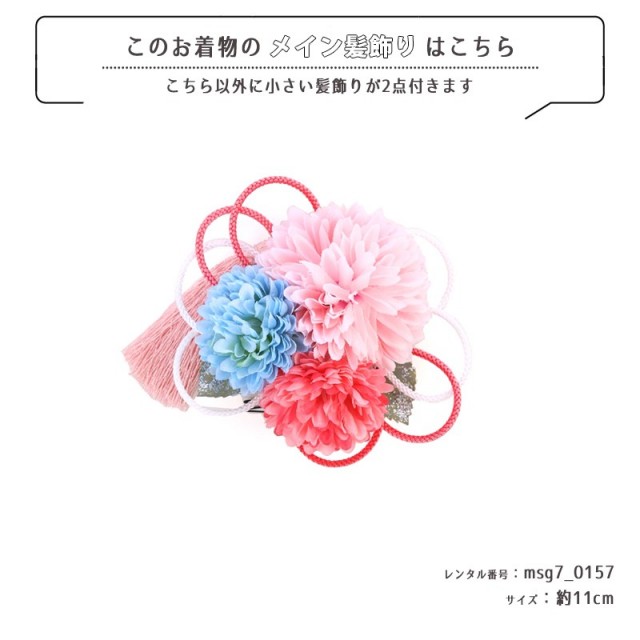 | コーディネート | 女の子七五三(7歳女の子用)に含まれる物:着物、長襦袢(カット袖)、作り帯、草履、バッグ、帯揚げ、箱迫、帯〆、しごき、末広(扇子)、足袋、腰紐(3本)、コーリンベルト、伊達締め、髪飾り |
