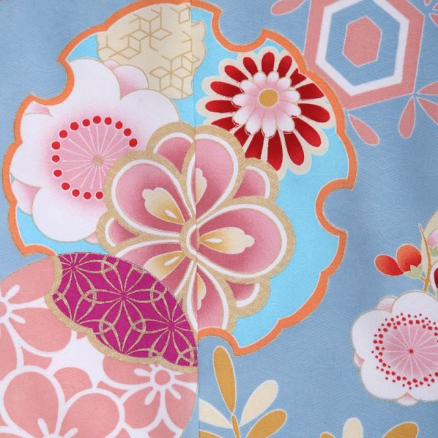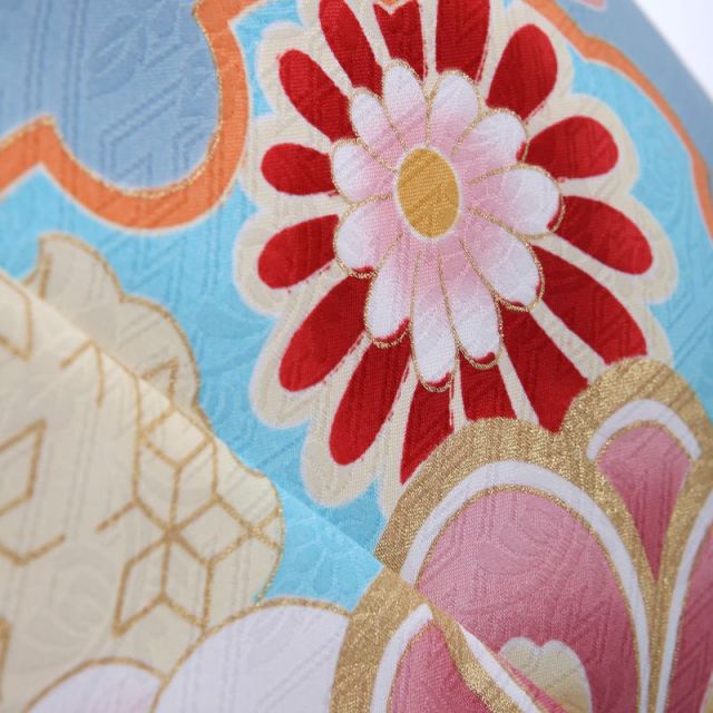生地の地紋は、『卍』の漢字を斜めに崩して連続模様にした紗綾型に、蘭や菊を配した“本紋”という合せ文です。紗綾型は絶えることなく長く続くという『不断長久』の意味があり、家の繁栄や長寿を願う文様になります。光沢を感じさせる紗綾型に蘭や菊をあしらった本紋は、より高い品格をもたらしてくれます。水色のお着物は、まるで澄んだ空を思わせます。淡い雪と梅・桜・菊などの優美な花々が爽やかな空に舞っているかのように描かれています。雪の紋は、ふんわりした牡丹雪のような雪輪文様と、つららの形をした氷柱雪が見られます。雪が空から舞い降りるさまは花に例えられ『雪花』と言い、雪の様々な結晶を花に見立てた風情ある文様です。雪どけ水の恵みによって花が咲き誇り、実り豊かな季節になる。雪は豊穣の兆しとされ、縁起の良い吉祥文様です。梅・桜・菊と日本を代表する花々は、お子様の美しい成長と幸せな未来を願う意味を込めて描かれており、麗しい四季の移ろいを雪の文様とともに表現しています。七五三の愛らしいお姿は7歳の今しか見られません。雪花のごとく、はかなげで可愛らしいお子様をご家族皆さまで存分にお祝いしましょう。