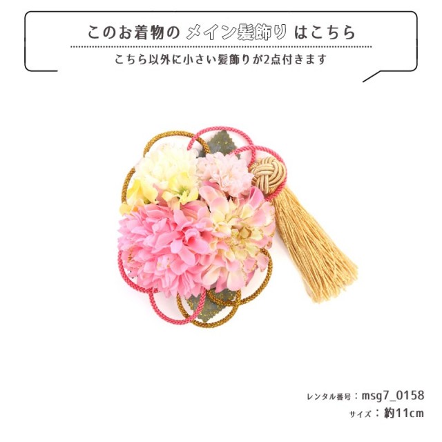 | コーディネート | 女の子七五三(7歳女の子用)に含まれる物:着物、長襦袢(カット袖)、作り帯、草履、バッグ、帯揚げ、箱迫、帯〆、しごき、末広(扇子)、足袋、腰紐(3本)、コーリンベルト、伊達締め、髪飾り |