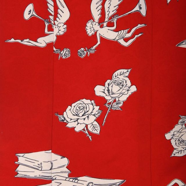 「過去と未来をつなぐ」をコンセプトに着物界に新たな風を吹かせているモダンアンテナより、ポップさとレトロさを兼ね備えたおしゃれな1着。古風な着物に使われているような落ち着いた赤の色味をベースに、ポップなイラストが描かれています。ベースの赤とイラストのオフホワイトがレトロな印象を与えるので、遠目には「鶴の柄?」と古風な絵柄を思わせるのですが、近づいてみると天使・お城・本・薔薇が描かれているなんともビックリな面白さがあります。このイラストの少しゆるく、可愛らしい雰囲気がその面白さを引き立ててくれます。これらの可愛いイラストはご両親の女の子を想う気持ちを象徴するアイテムでもあります。天使には「純粋無垢」なイメージがあり、女の子の可愛らしさを思わせます。薔薇の花言葉は「上品」という意味があり、お城は「お姫様」を思わせ、本は「利発さ」を象徴します。帯や小物もシンプルで主張しすぎない色がセレクトされていますので、着物の色と柄の可愛さを最大限に引き出してくれます。古風さは失わない着物を着て欲しいと思うご両親にも、周りの女の子と同じような着物は着たくない!というおしゃれな女の子にもオススメのお着物です。
