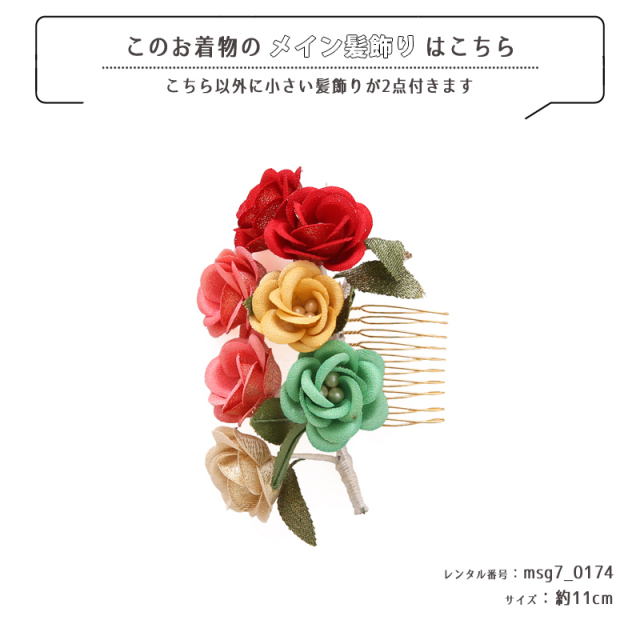 | コーディネート | 女の子七五三(7歳女の子用)に含まれる物:着物、長襦袢(カット袖)、作り帯、草履、バッグ、帯揚げ、箱迫、帯〆、しごき、末広(扇子)、足袋、腰紐(3本)、コーリンベルト、伊達締め、髪飾り |
