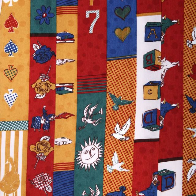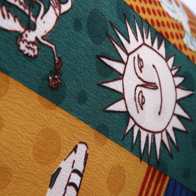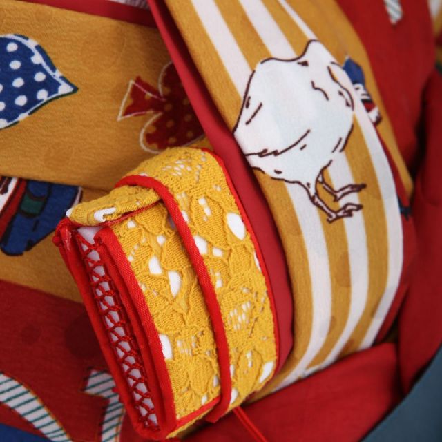 「過去と未来をつなぐ」をコンセプトに、レトロなデザインとモダンファッションを融合させた着物を世に送り出しているモダンアンテナ。こちらのお着物のレトロで奇抜な色使いは、大正ロマンを思わせるモダンな可愛さで、まさにモダンアンテナらしい1着です。着物の生地に織られている地紋は様々なサイズの水玉です。一般的に地紋は古典的なものが多く、水玉柄はなかなか見つけられません!着物には現代的なイラストが描かれているのもポイント。よく見ると様々なアイテムが登場しています。本、薔薇、太陽、天使、白い鳩、アヒル、お花、数字、スペード・・・など、どれも童話に出てきそうなアイテムばかり。これから新しい人生のページをめくっていく女の子を応援するようで、ワクワクさせてくれます。帯や小物は着物に使われている色に合わせてセレクトし、着物のデザインが生きるようにコーディネートされています。しごきと箱迫はよく見るとレースになっており、現代ファッションを取り入れています。レトロとモダンどちらも欲しい!と思っている方にはオススメのオシャレな祝い着です。