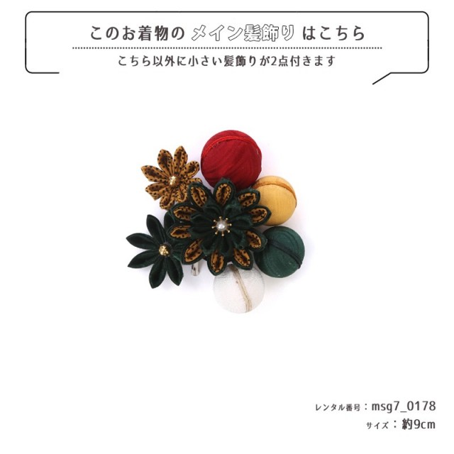 | コーディネート | 女の子七五三(7歳女の子用)に含まれる物:着物、長襦袢(カット袖)、作り帯、草履、バッグ、帯揚げ、箱迫、帯〆、しごき、末広(扇子)、足袋、腰紐(3本)、コーリンベルト、伊達締め、髪飾り |