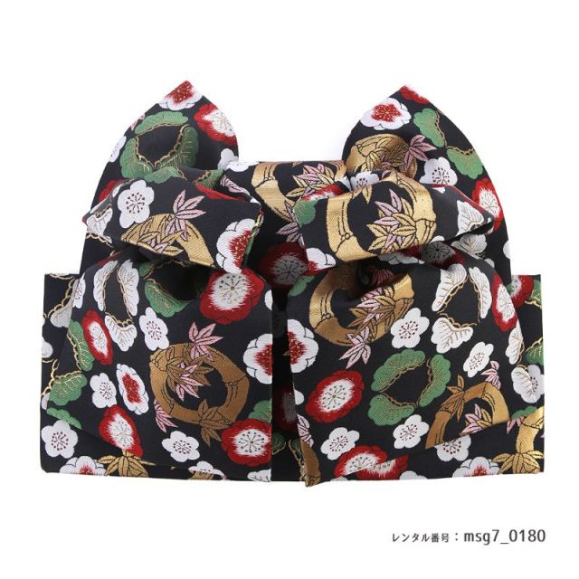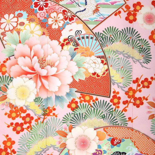 タレントの乙葉さんが手がける「家族の絆」をテーマにしたブランドより、古典的な文様の美しさを最大限に引き出した清楚な1着です。古風な文様をふんだんに使いつつも、古さを感じないデザイン。古典にこだわった乙葉さんのセンスが光っています!1番に目に留まるのが中央の澄んだ空を飛ぶ2羽の「鶴」。鶴は古来より長寿を象徴する文様として晴れ着に使われてきました。また、さらに縁起を良くしてくれているのが、全体に伸び上がった「梅」と「松」です。枝まで描かれた梅と松が裾から顔まわりに向かって高く伸びて広がっています。梅と松は「松竹梅」に表されるおめでたい植物文様の代表で、お祝いにはぴったりです。鶴の下には高貴なアイテムの象徴である「扇」やぷっくりと満開に咲いた「牡丹」がお着物をさらに華やかに仕上げてくれています。黒地の帯には「梅」や「松」などの文様が金をあしらって描かれていてとても豪華です。帯揚げとしごきには円が繋ぎ合和され、永遠を意味する「七宝柄」が使われています。日本古来より使われる文様にはこのように繁栄や幸せを願う意味があります。ご両親の女の子の成長を願う気持ちを込めて、伝統的な絵柄を選ぶのはいかがでしょうか。