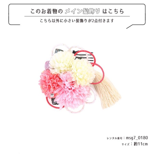 | コーディネート | 女の子七五三(7歳女の子用)に含まれる物:着物、長襦袢(カット袖)、作り帯、草履、バッグ、帯揚げ、箱迫、帯〆、しごき、末広(扇子)、足袋、腰紐(3本)、コーリンベルト、伊達締め、髪飾り |