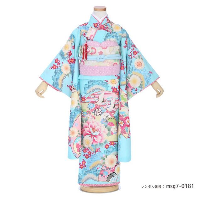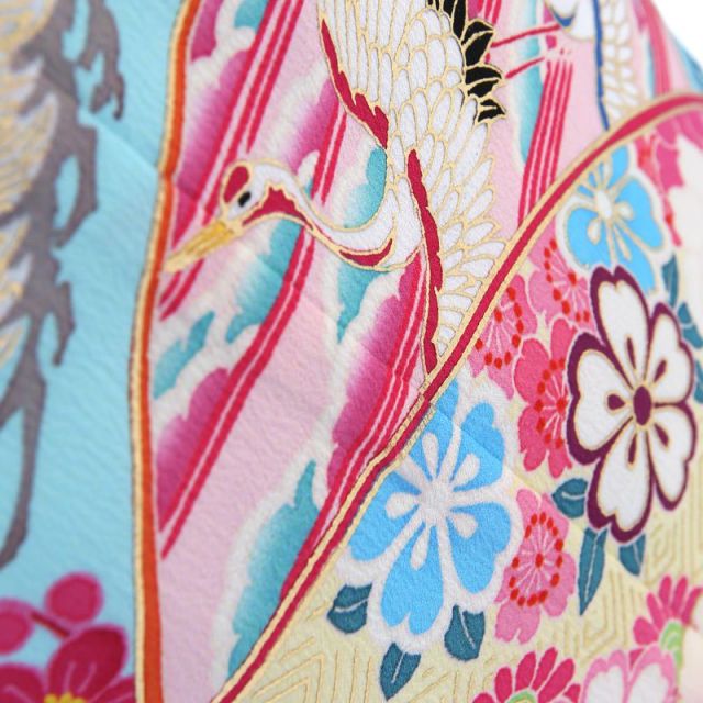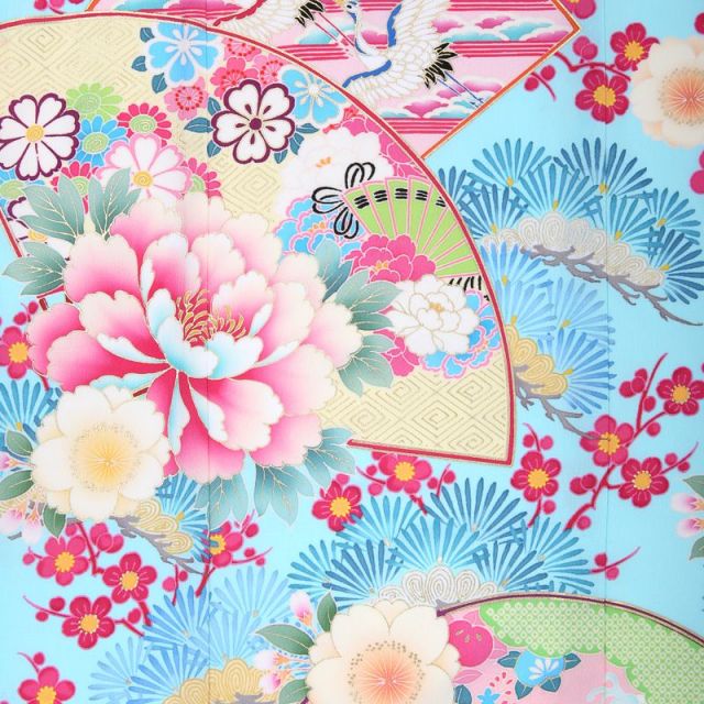 タレントの乙葉さんが手がける「家族の絆」をテーマにした古典文様を大切にしているブランド。明るいブルーをベースにした古風で清楚な1着です。爽やかな雰囲気が七五三のお祝いにぴったり。1番に目に留まるのが中央の澄んだ空を飛ぶ2羽の「鶴」。鶴は古来より長寿を象徴する文様として晴れ着に使われてきました。夕暮れを優雅に飛んでいる姿も美しく、未来への飛躍の意味も込められています。さらに縁起を良くしてくれているのが、全体に伸び上がった「梅」と「松」です。枝まで描かれて、梅と松が裾から上に高く伸びて広がっていく様を表し、縦のラインが強調されて、すらっとした姿になります。その他にも高貴なアイテムの象徴である「扇」やぷっくりと満開に咲いた「牡丹」がお着物をさらに華やかに仕上げてくれます。帯や小物類は着物に使われている、ライトブルー、ピンク、白を基調にし、着物の柄が生きるようなコーディネートになっています。このように日本古来より使われる文様には繁栄や幸せを願う意味があります。女の子の幸せな人生を願って、古典的なお祝いの柄が沢山描かれたお着物を選んでみてはいかがでしょうか。