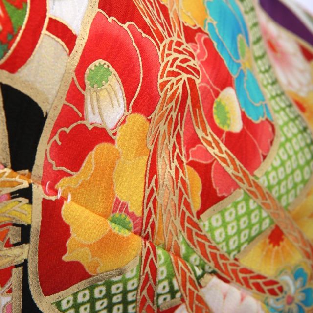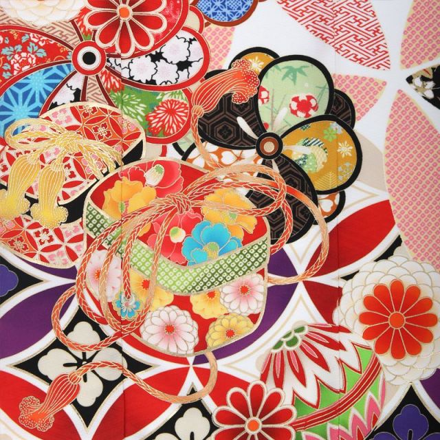 和紙専門店の榛原(はいばら)が送り出す、古典的な文様がふんだんに散りばめられた豪華な1着です。上半身は地色の白の印象が強いですが、裾に行くほど様々な柄があしらわれ、たくさんの色が使われた豪華絢爛な雰囲気になってきます。顔まわりは落ち着いた雰囲気を出すことができるので、派手すぎない上品な仕上がりになります。正面に描かれたお花の柄があしらわれた文箱は平安時代には手紙を入れておく箱として使っており、優雅さと気品を象徴する文様として着物に使われてきました。賢く、気品のある女の子に育って欲しいという願いが込められています。裾や袖には赤と黒で描かれた「七宝柄」の中に「花菱」の文様がダイナミックに配置されています。「七宝柄」は円が永遠に重なって続くことから、円満や良いご縁に恵まれますようにという願いの込められた縁起の良い古典柄です。「花菱」は平安時代の公家の調度品などに用いられていた柄のため、現代でも高貴な柄として大切にされています。着物の中央には「ねじり梅」、「菊」が描かれています。「梅」は寒い冬を乗り越え、早春に美しい花を咲かせることから「忍耐」「美麗」の意味があり、「菊」は古くより縁起の良い植物として日本で愛されてきました。とにかく縁起が良く、古風さと気品を感じられるオススメの1着です。