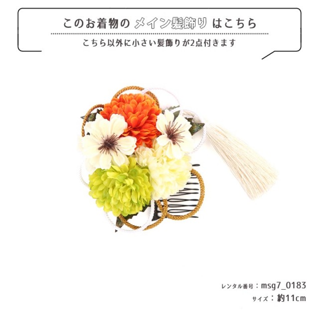 | コーディネート | 女の子七五三(7歳女の子用)に含まれる物:着物、長襦袢(カット袖)、作り帯、草履、バッグ、帯揚げ、箱迫、帯〆、しごき、末広(扇子)、足袋、腰紐(3本)、コーリンベルト、伊達締め、髪飾り |