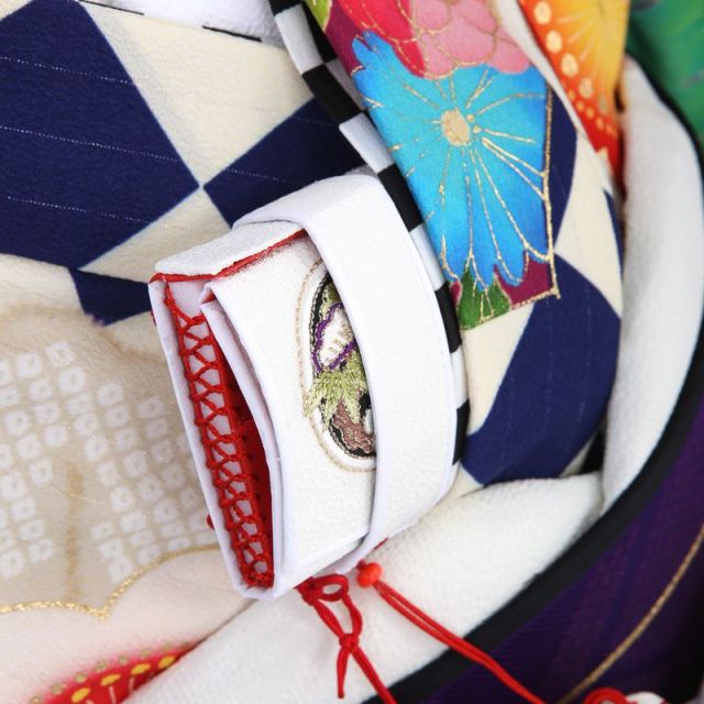白と藍色の市松模様がポップで目に留まる1着です。舞台衣装のような豪華絢爛なお着物ですが、ただ派手なわけではないんです。着物に描かれる文様は伝統的なものばかり!2色の正方形を交互に敷き詰めた市松模様は、古来より愛されてきた幾何学文様。市松模様の上に描かれているのは「松」、「梅」、「扇」など日本古来より縁起が良いとして大切にされてきたものばかり。松と梅は縁起の良い植物であることはご存知でしょうか。「松竹梅」に称されるおめでたい植物の代表格です。平安貴族の必需品であった「扇」は、末広がりであることから吉兆の意味を持っています。また、扇には「麻の葉」に「菊」とブルーの六角形に囲まれた「唐花」が描かれています。「麻の葉」は子孫繁栄、「菊」は長寿を象徴、「唐花」は中国より渡来したお花で着物によく使われている柄です。実際に存在していたら、オシャレで誰もが目を留めるであろう色もデザインも豪華な扇です。縁起の良い文様オンパレードの幸せいっぱいのお着物です。一生に一度のイベントに豪華絢爛なお着物を選ばれてはいかがでしょうか。
