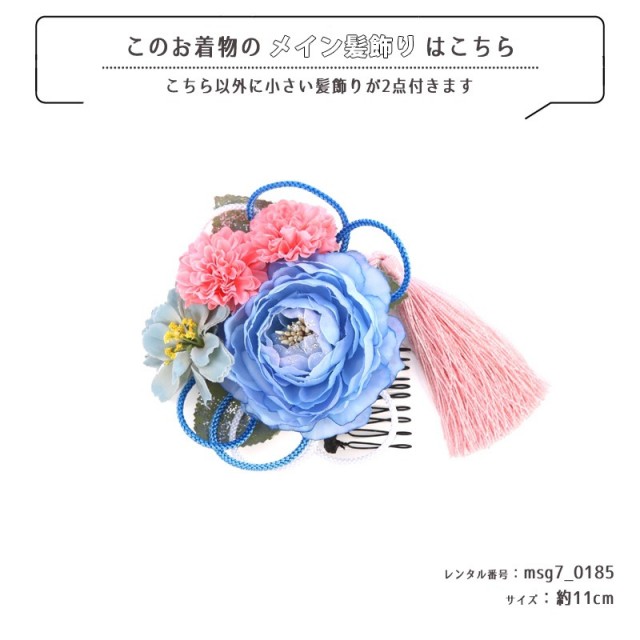| コーディネート | 女の子七五三(7歳女の子用)に含まれる物:着物、長襦袢(カット袖)、作り帯、草履、バッグ、帯揚げ、箱迫、帯〆、しごき、末広(扇子)、足袋、腰紐(3本)、コーリンベルト、伊達締め、髪飾り |