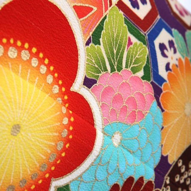オシャレな女の子にオススメしたい着ているだけで華やかに見えるコーディネート。舞台衣装のような豪華絢爛なデザインと色使いのお着物ですが、ただ派手なわけではないんです。着物に描かれる文様は伝統的なものばかり!まず、2色の正方形を交互に敷き詰めた市松模様は、古来より愛されてきた幾何学文様。白と黄緑という色使いが現代的でおしゃれです。市松模様の上に描かれているのは「松」、「梅」、「扇」など日本古来より縁起が良いとして大切にされてきたものばかり。松と梅は縁起の良い植物であることはご存知でしょうか。「松竹梅」に称されるおめでたい植物の代表格です。平安貴族の必需品であった扇は、末広がりであることから吉兆の意味を持っています。また、扇面にも描かれているのが「麻の葉」に「菊」とブルーの六角形に囲まれた「唐花」です。「麻の葉」は子孫繁栄、「菊」は長寿を象徴、「唐花」は中国より渡来したお花で着物によく使われている柄です。こんなオシャレな扇、現代ではなかなか見ることができません。縁起の良い文様しかないと言えるほど、幸せいっぱいのお着物です。