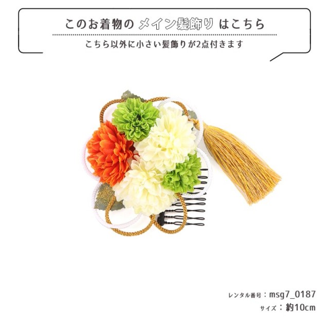 | コーディネート | 女の子七五三(7歳女の子用)に含まれる物:着物、長襦袢(カット袖)、作り帯、草履、バッグ、帯揚げ、箱迫、帯〆、しごき、末広(扇子)、足袋、腰紐(3本)、コーリンベルト、伊達締め、髪飾り |