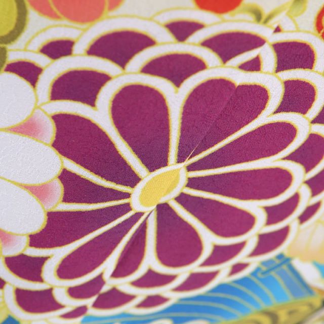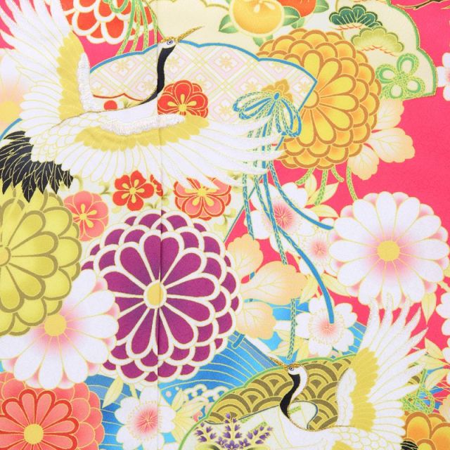 サーモンピンクが眩しいお着物は裾と袂(たもと)には波が広がり、鶴が飛ぶ。袖や胸元には桜の木が伸び上がり、花びらが舞っています。今にも気持ちの良い風が吹きそうな景色。ストーリーが見えるようなデザインですね。波の文様は「青海波(せいがいは)」と呼ばれ、穏やかな波のように平穏な日々が続くという意味が込められています。翼を広げ、上に向かって優雅に飛ぶ鶴は「長寿」を象徴しており、日本で古くから愛される定番の文様です。桜は日本人にとって新しい始まりを感じさせる大切な植物ですよね。これから元気に成長し、幸せな女性の人生を歩んで欲しいという願いを込めた七五三には桜はぴったりです。鶴の周りには縁起の良いハッピーなアイテムが描かれていて、見ているだけで幸せな文様ばかり。長寿の象徴「菊」、おめでたい「松」、末広がりな「扇」、子孫繁栄の象徴「橘」などとにかく縁起が良いんです。文様の色もパステルカラーを中心に可愛らしい雰囲気に仕上がっています。また帯揚げと帯締めにビビットなグリーンを入れることで、お着物のサーモンピンクに更にアクセントを加えてくれます。景色が浮かぶような素敵なデザインにお祝いの気持ちを込めてはいかがでしょうか。
