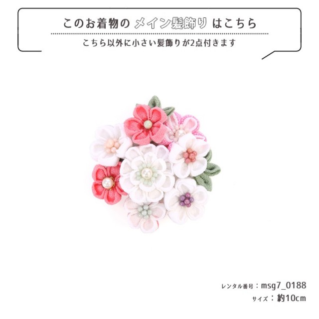 | コーディネート | 女の子七五三(7歳女の子用)に含まれる物:着物、長襦袢(カット袖)、作り帯、草履、バッグ、帯揚げ、箱迫、帯〆、しごき、末広(扇子)、足袋、腰紐(3本)、コーリンベルト、伊達締め、髪飾り |