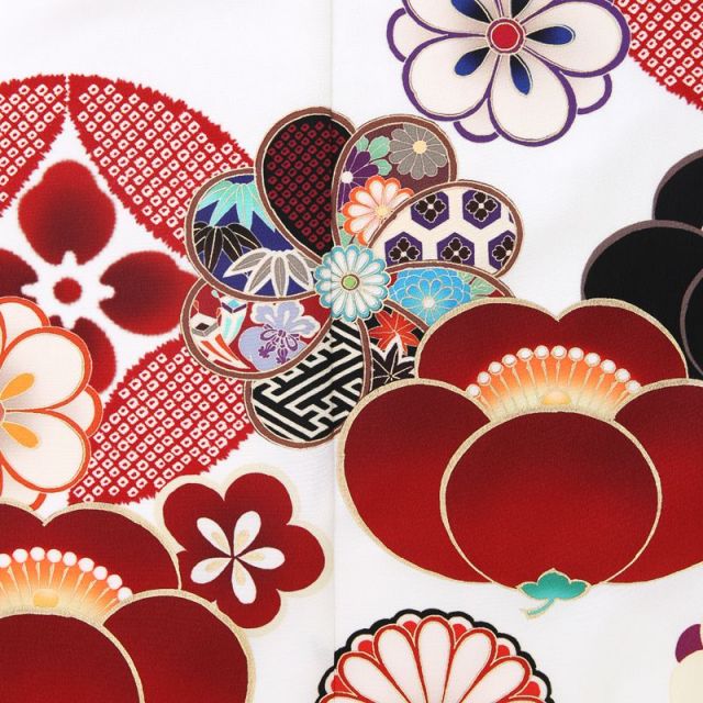 様々な七五三着物の提案を行ってきたJAPAN STYLEの赤が印象的なこちらのお着物。女性の強さや活発さを感じさせるデザインが元気な女の子を思わせます。描かれている文様はどれも古典的なものばかりですが、ユニークなのはその大きさと配置。ひとつひとつの文様サイズがとても大きく、花がパッと咲いたような華やかさがあります。特に立体的に描かれている「梅」に目が奪われますが、「梅」は暖かくなる春が来る前に花を咲かせます。そんな寒さに耐え、美しく咲く姿から忍耐や健康の意味を持っているんです。その他にもお花をねじった様な文様の中にはどれも古典的でおめでたい意味を持つ文様が描かれ、細かいところまで七五三のお祝いの気持ちを表現しているような素敵なデザインになっています。華やかさを求める方には特におすすめしたい1着です。