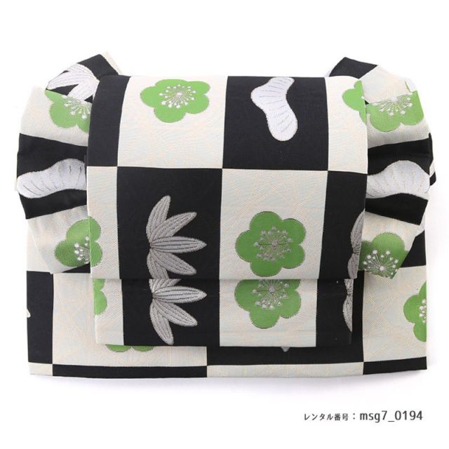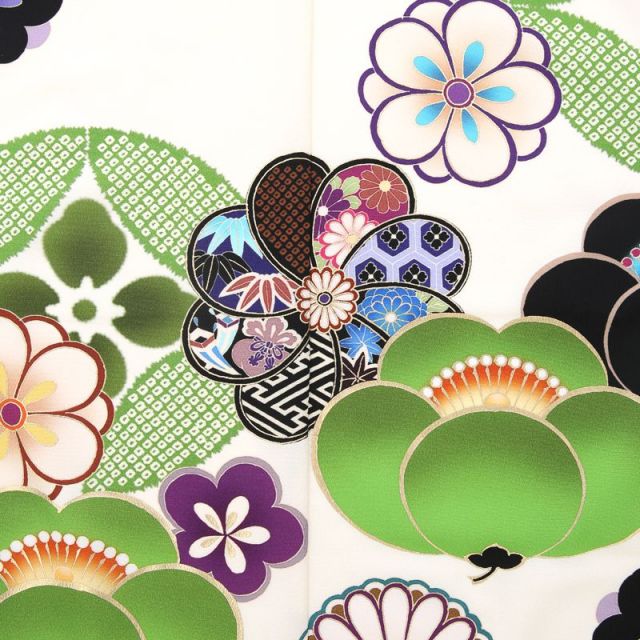 着物ブランドJAPAN STYLEが元気の出るクールな雰囲気をコーディネート。着物に大きく描かれた花の文様が印象的で、元気な女の子を表すようなデザインとなっています。特にユニークなのが立体的に描かれた梅の文様。花びらに施された緑のグラデーションが美しいです。梅は「松竹梅」で知られる、古くからおめでたいと言われてきた花の一つです。寒い時期に美しい花を咲かせるその強さに健康や忍耐の意味を重ね、日本人は大切にしてきました。また、紫色が効果的に使われているところも魅力のひとつ。着物の一部のお花の柄に使われている紫と、帯揚げとしごきの紫がコーディネート全体に統一感を与えています。女の子の活発さと上品さを一緒に表現したような個性溢れる可愛い1着です。