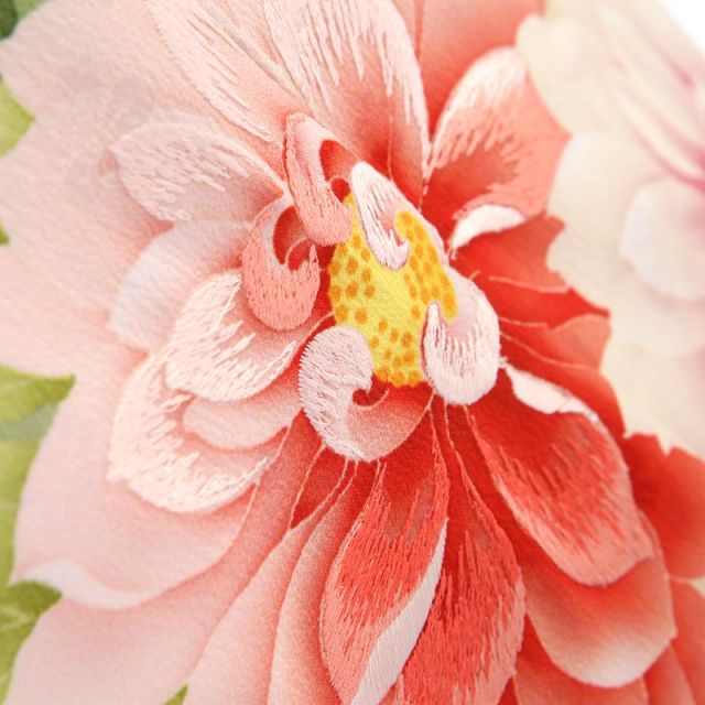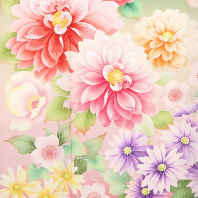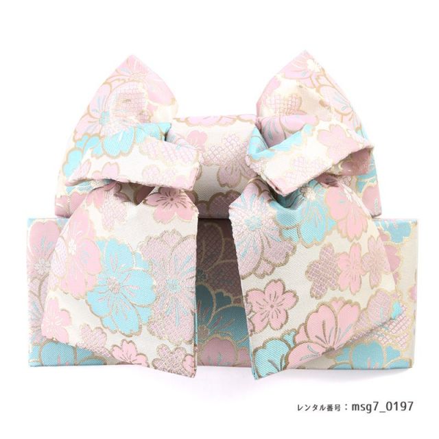 柔らかい雰囲気の中にも強さを感じるこちらのデザインは、タレントの乙葉さんがプロデュースしたもの。グリーンからピンクへのグラデーションは気品と可愛さ両方を感じさせます。袖や顔まわりには「桜」が満開に咲き、帯周りには優しいパステルカラーを使用。それと対比して裾へ向かうほど、刺繍のあしらわれた洋花が立体感を出し、地色は元気なピンクへのグラデーションに変わっていきます。そんな様々な姿を見せているところがこちらのお着物の魅力です。「桜」には新しい出発の背中を押すような存在感があり、大人の階段をのぼる七五三のお祝いにはぴったり。帯にもピンクやブルーのパステルカラーで「桜」が描かれており、コーディネート全体で統一感のある仕上がりとなっています。