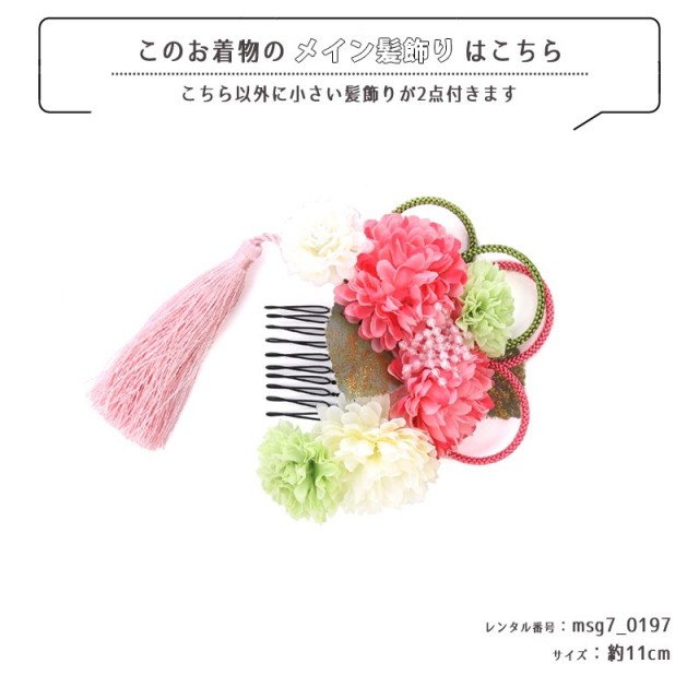 | コーディネート | 女の子七五三(7歳女の子用)に含まれる物:着物、長襦袢(カット袖)、作り帯、草履、バッグ、帯揚げ、箱迫、帯〆、しごき、末広(扇子)、足袋、腰紐(3本)、コーリンベルト、伊達締め、髪飾り |