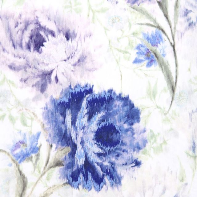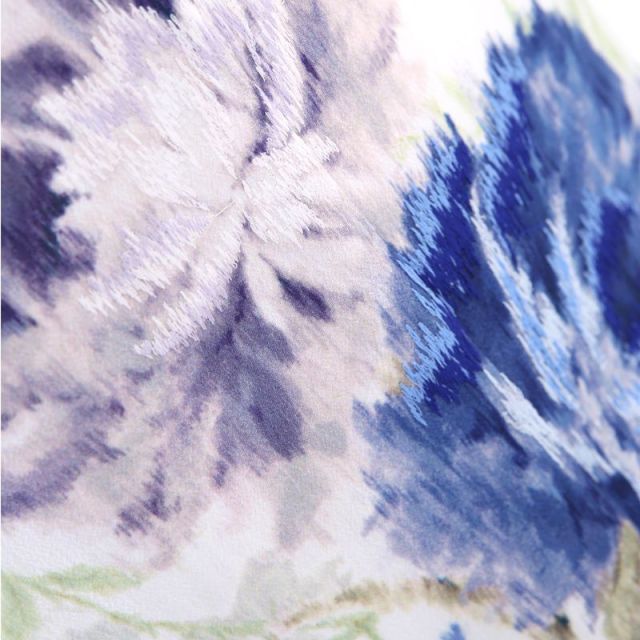 一般的に伝統文様のイメージが強い七五三の衣装ですが、こちらのお着物は洋服にも通づるおしゃれを貫いた個性的な1着です。オフホワイトを基調としたお着物は全体に清楚で上品な印象を与えます。そこに描かれているのは薄いグリーンとブルーを基調とした「撫子(なでしこ)」を思わせる抽象的な花々。撫子は大和撫子という言葉があるように日本人女性の上品・清楚な姿を象徴する植物。七五三にはぴったりなデザインです。膝あたりに描かれた大きな花には刺繍も施され、その繊細な雰囲気を強めています。また、帯のデザインはとても個性的です。黒レースを思わせる絵柄には洋風な花が描かれ、薄い色味の着物とのインパクトのあるコーディネートがクールで可愛い仕上がりにしてくれています。オリジナリティあふれるデザインで、既存の着物では満足できない現代の女の子にも楽しんでいただけるコーディネートです。