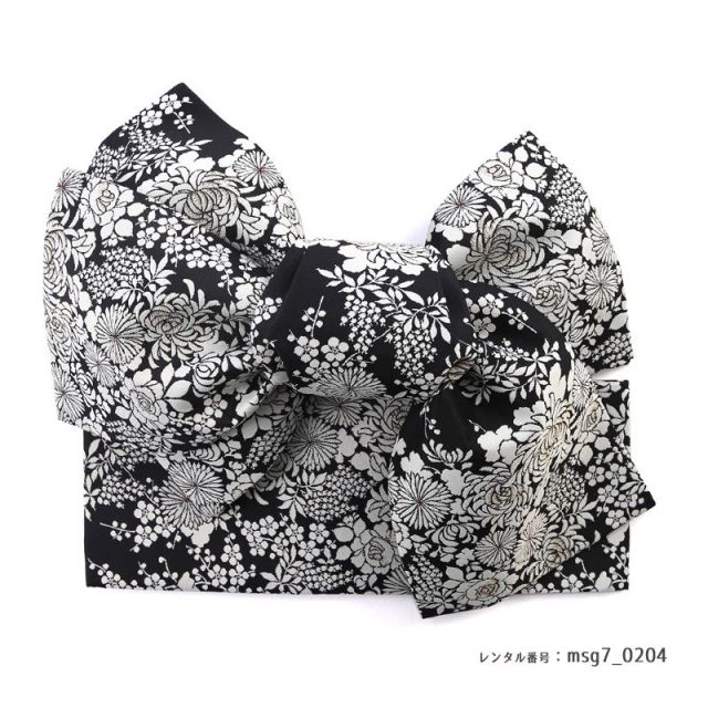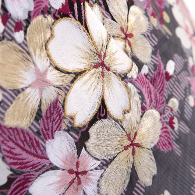 女性向けのアパレルブランドであるNATURAL BEAUTYが提案する、古風な雰囲気の中にモダンさも取り入れたおしゃれなデザインのこちらの着物。地色は黒にグレーの細かい縞を入れたようなストライプで、裾に向かうほど薄い色へグラデーションしていきます。全体に「桜」の花が描かれ、暗めの地色の上を白く輝くようなキラキラした印象になっています。日本人が昔から大切にしてきた「桜」は、着物の文様としても古くから使われてきました。「桜」の開花は人生の新たなスタートを感じさせ、背中を押してくれるような文様で、現在でも大人気です。こちらの着物をさらにゴージャスに仕上げているのが、「桜」に施された刺繍。キラキラとした金色の糸が効果的に使われ、お花の立体感と高級感が演出されています。帯はシックな黒と白の組み合わせですが、邪気を除けるという意味を持つ「菊」を中心に花々が描かれクールな印象に。このシックな帯が着物に描かれた文様をさらに引き立ててくれています。大人っぽい雰囲気を求めている方におすすめできる1着です。