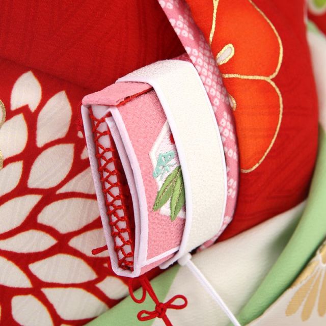 真っ赤な地色と愛らしい花の文様がキュートなこちらのお着物。伝統的なおめでたい文様を優しい色味を使って描くことで、現代でも古さを感じさせない古典的な美しさを表現しています。それも着物ブランドと老舗和菓子店のコラボだからこそ表現できる世界観!描かれている花々は和菓子の練り切りように、ぽってりとした可愛らしい仕上がりが魅力です。古典文様にはそれぞれ意味があります。様々なデザインで描かれている「菊」は浄化や魔除けを意味し、成長を守ってくれるお花です。今にも蕾が開きそうな「牡丹」は百花の王と呼ばれるほど、花びらが幾重にも重なり、大輪でぽってりとした姿が美しいと古くから愛されてきました。まだ満開でないところが、これから大人へと成長していく7歳の女の子にもぴったりな粋なデザインです。また全体的に古風な仕上がりながら、帯揚げとしごきにはグリーンと白のストライプを合わせています。その色合いと雰囲気から全く違和感なく全体のコーディネートはバッチリなところがまたおしゃれ!古典の美しさと現代にもぴったりな可愛らしさが七五三にはぴったりです。