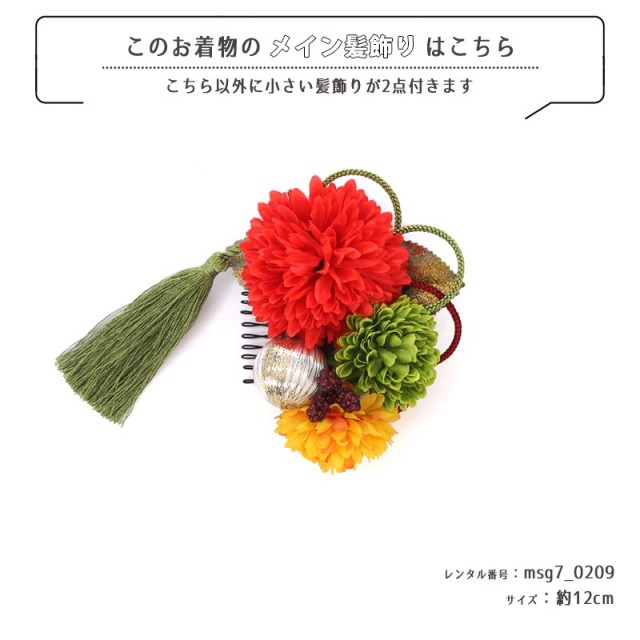 | コーディネート | 女の子七五三(7歳女の子用)に含まれる物:着物、長襦袢(カット袖)、作り帯、草履、バッグ、帯揚げ、箱迫、帯〆、しごき、末広(扇子)、足袋、腰紐(3本)、コーリンベルト、伊達締め、髪飾り |