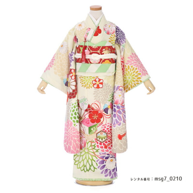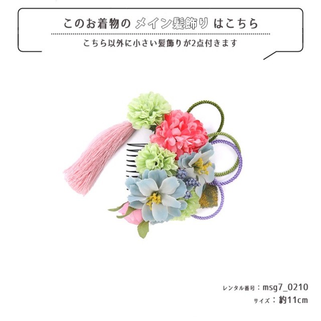 | コーディネート | 女の子七五三(7歳女の子用)に含まれる物:着物、長襦袢(カット袖)、作り帯、草履、バッグ、帯揚げ、箱迫、帯〆、しごき、末広(扇子)、足袋、腰紐(3本)、コーリンベルト、伊達締め、髪飾り |
