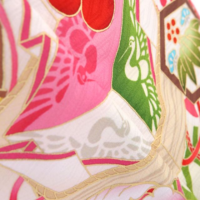 オフホワイトの地色に可愛らしい文様が散りばめられた、とにかく上品で女の子らしい印象のお着物です。さすが長年古典柄を中心としたデザインをしてきた九重と、長年様々な和菓子を世に送り出してきた亀屋良長らしく、古典の可愛さが全開。様々なパステルのような可愛い色で描かれた「菊」は古くから魔除けや長寿の意味があり、おめでたい文様として大切にされてきました。また満開になる時を待っているようなぽってりとした「牡丹」も描かれています。百花の王という別名を持ち、その可憐な姿に女性の美しさを重ねて着物の文様として使われます。これから大人に向かっていく7歳の女の子を表現するかのように蕾で描かれているところがとってもおしゃれです。その他にも「鶴」「藤」「梅」「松」など伝統的でおめでたい文様が所々に描かれていて、とにかく古典を大切にしたデザインとなっています。清楚で上品なコーディネートをぜひお楽しみください。