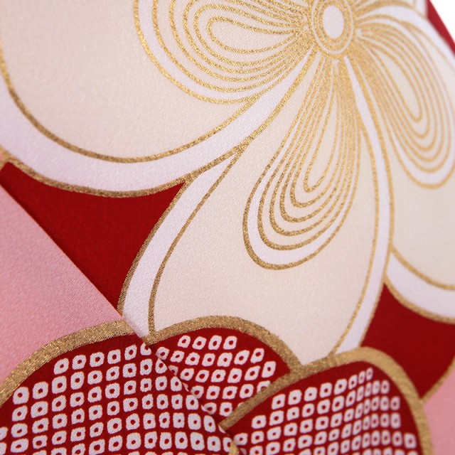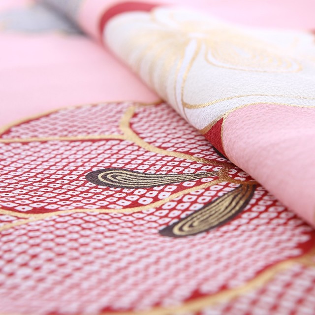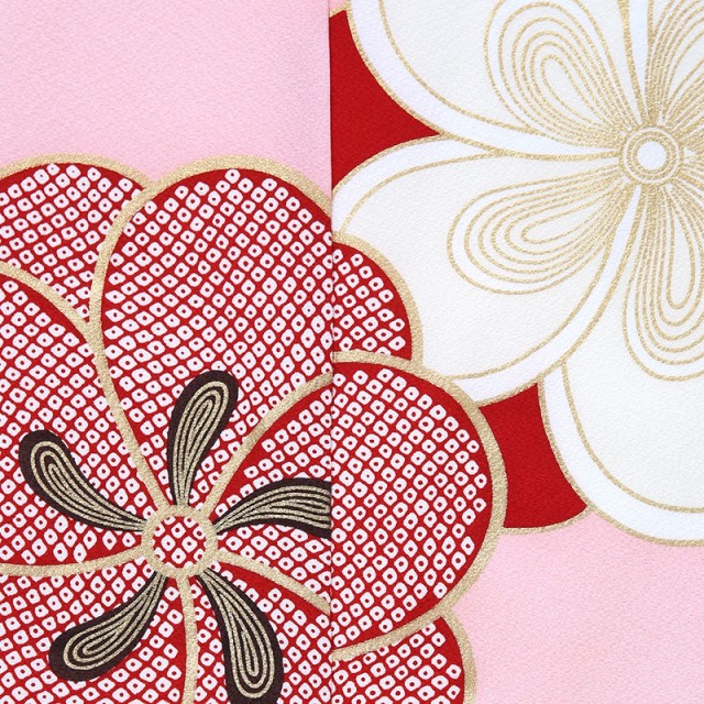 思わず顔がほころぶ、そんな可憐なピンクは「乙女色」と呼ばれる伝統色です。乙女椿のような少し黄みを含んだ紅色を指しますが、色名からも女の子らしい可愛さが伝わってきます。乙女椿は、早春に八重咲きの花をつける椿のことで、花言葉は「控えめな美」。柔らかい雰囲気で、その場を優しく包んでくれるようなはんなりした色彩で仕上げました。着物に大きく描かれるのは「梅」。「ねじり梅」と呼ばれる古典的な吉祥文様です。梅は、厳しい冬が終わるといち早く香り高い花を咲かせます。人生の中で辛く厳しいことがあっても、負けずの乗り越えてほしいと願いが込められます。逆境に負けない力強さ、忍耐力、生命力を表す文様です。大きく存在感がありますが絞り柄で描くことで、上品で格調高さを感じます。おめでたい席に相応しい品位ある大人っぽい装いに。いつもよりお姉さんに見えるのではないでしょうか。古典的で華やかな色彩は、大切な晴れの日に華を添えてくれるでしょう。