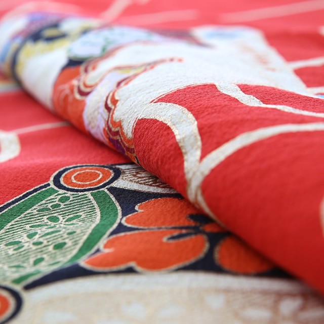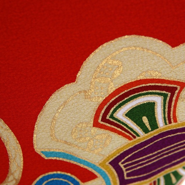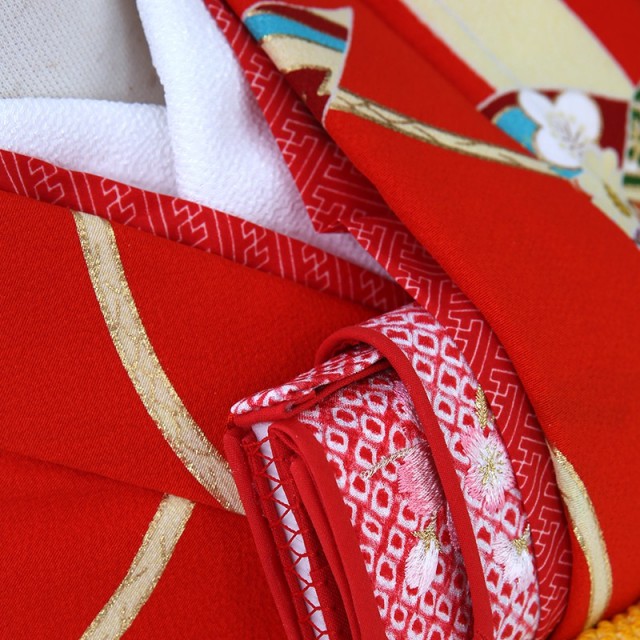 鮮やかな赤色の着物に、縁起のいい文様が沢山描かれた古典着物です。「赤色」は古くより厄除けの色とされてきました。また太陽の色と似ているとされ、生命力や活力の意味も含まれています。女の子着物で赤色はよく使用されますが、可愛いだけでなく力強い美しさも感じる色になっています。そして、やはり赤色の着物は正統派な印象を与えます。描かれる文様は、おめでたい吉祥文様。「折鶴」は鶴を文様化したものです。「鶴は千年、亀は万年」の言葉があるように長寿を意味します。また純白の羽を持ち、立ち姿飛ぶ姿ともに美しいとされており、高貴さ、誇り高き美しさを表しています。「宝尽くし」は福徳を招く文様です。「打ち出の小槌」は、一生物に困らないように、願いを叶えるものとして。「隠れ笠」は、危険なことから隠れ守ってくれるお守りのような存在。「分胴」は富の象徴とされお金に困らないようにという意味があります。色彩も描かれる文様も、古来受け継がれてきた日本の伝統と格式を誇るものばかりです。伝統的なイベントに相応しい非常に上品な装いに仕上がりました。