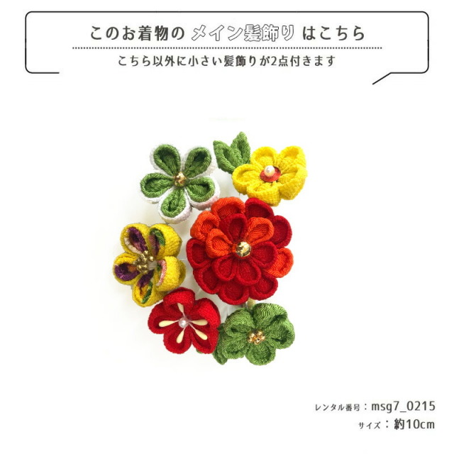 | コーディネート | 女の子七五三(7歳女の子用)に含まれる物:着物、長襦袢(カット袖)、作り帯、草履、バッグ、帯揚げ、箱迫、帯〆、しごき、末広(扇子)、足袋、腰紐(3本)、コーリンベルト、伊達締め、髪飾り |