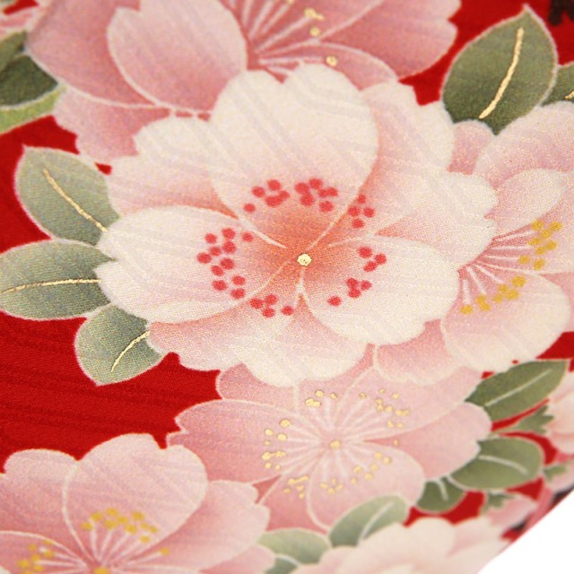平安時代のお姫様がタイムスリップしてきたようなこちらの着物。鮮やかな赤が華やかで、目を惹きつけます。「赤色」は、古くより厄除けの色とされてきました。また太陽の色と似ているとされ、恵みの象徴だったことから生命力や活力を表します。美しさの中にどこか力強さを感じるので、可愛いだけでなく凛とした印象を与えます。描かれる文様も、おめでたい吉祥文様ばかり。穏やかな春の日のように満開に描かれる「桜」は、咲き誇る姿から?栄や豊かさを意味します。「貝桶」は、貝合わせの道具を入れる入れ物です。平安時代の宮中の遊びで、同じ絵柄の貝を合わせることから、夫婦円満の象徴とされており、良縁に恵まれるようにという願いが込められます。そして御所車の車輪部分のみを文様化した「源氏車」は、美しい花々と一緒に描くことで更に豪華になり、源氏物語の世界を象徴する雅なものとして高貴さを表します。また「源氏」という公家の名を付けることで格の高さを表します。これぞ王道と呼べる正統派着物。古典的な着物は、やはり他とは違った品格を感じます。特別な日に相応しい装いになりました。