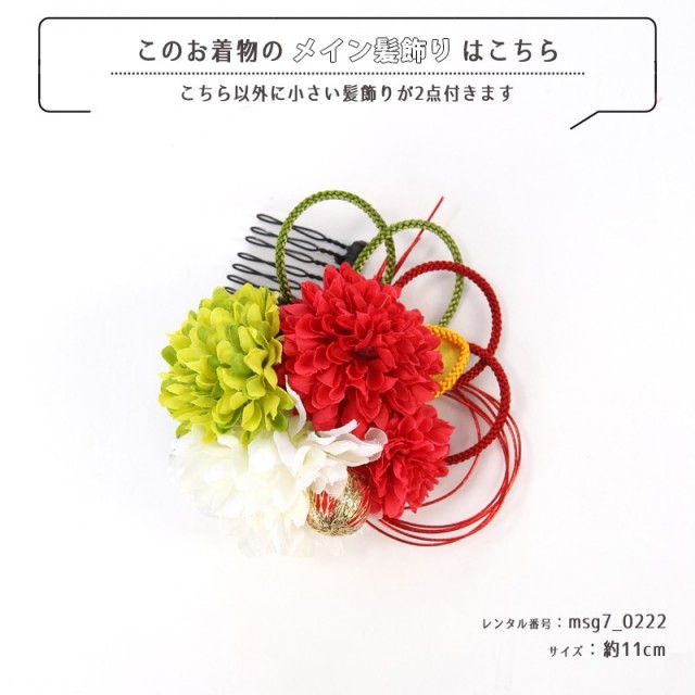 | コーディネート | 女の子七五三(7歳女の子用)に含まれる物:着物、長襦袢(カット袖)、作り帯、草履、バッグ、帯揚げ、箱迫、帯〆、しごき、末広(扇子)、足袋、腰紐(3本)、コーリンベルト、伊達締め、髪飾り |