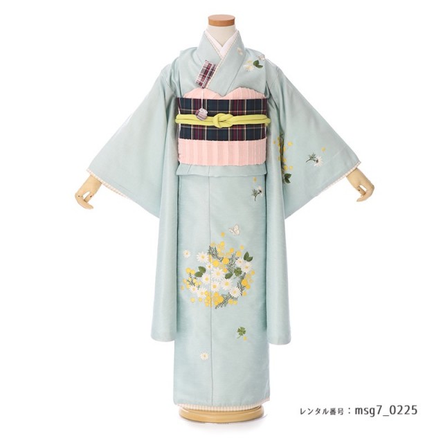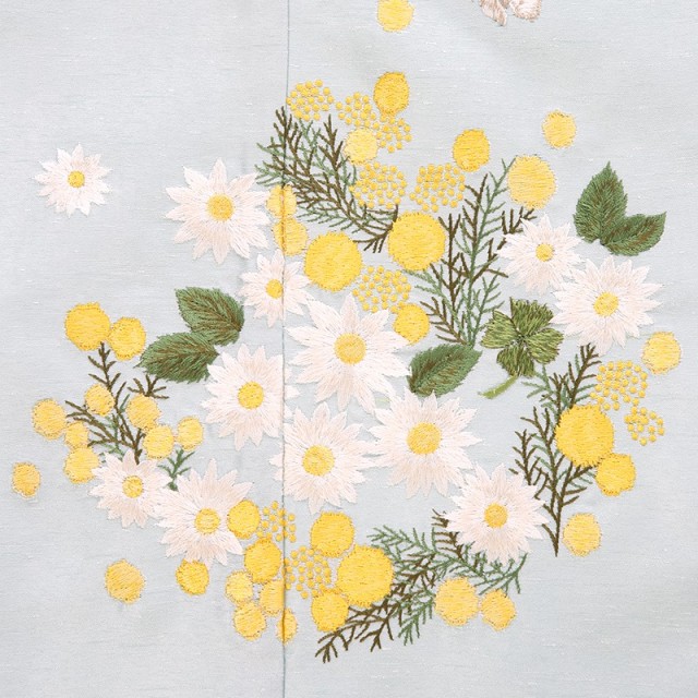 心癒される落ち着いた「アイスブルー」は、少しくすんだブルーなので優しい印象を与えます。描かれるのは可愛らしい小さな花々。ふわふわの「ミモザ」は、小さく丸い明るい黄色の花が非常に可愛らしく、春の訪れを感じます。花言葉は「感謝」「優雅」「エレガント」。これからの人生、感謝の気持ちを忘れないようにという願いが込められます。白い花は「デイジー」でキク科の花です。花言葉は「平和」「希望」「無邪気」。これからの平和を願い、希望に満ち溢れた幼い子のお祝いの日にぴったりですね。「四つ葉のクローバー」は、幸福の象徴、「蝶」は優美で可愛らしい姿は美しさを表します。使用される色彩や、文様が古典すぎず、女の子の可愛さが引き立つ着物に仕上がりました。ふわっとした雰囲気が、温かい幸せな気持ちにしてくれます。お子様にとっても、蝶や花、クローバーなど身近なものが描かれているので、気に入っていただけるのではないでしょうか。幸せな日に相応しいこちらの着物。ぜひおすすめしたい1着です。