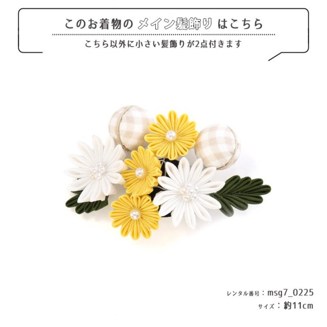 | コーディネート | 女の子七五三(7歳女の子用)に含まれる物:着物、長襦袢(カット袖)、作り帯、草履、バッグ、帯揚げ、箱迫、帯〆、しごき、末広(扇子)、足袋、腰紐(3本)、コーリンベルト、伊達締め、髪飾り |