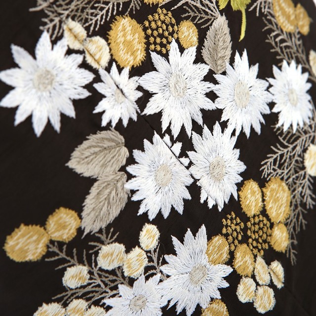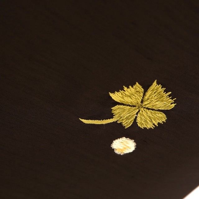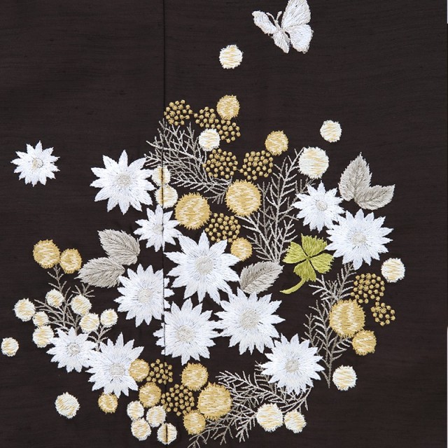 上質で重厚感のある黒の着物にシンプルに文様が描かれ、大人の着物のような落ち着いた雰囲気があります。黒色は、大人の女性の第一礼装で使用されるので、正統派で格調の高さを感じます。女の子の着物は可愛らしい色が多い中で、他とは違った上品で凛とした装いをしていただけます。全体には格好良い雰囲気ですが、描かれる文様は可愛らしい花々や蝶。「ミモザ」は、丸くコロンとした黄色の花が可憐で、春の訪れを感じさせ幸せな気持ちにしてくれます。花言葉は「感謝」「優雅」「エレガント」。感謝の気持ちを大切にこれからの人生を歩んでほしいという想いが込められます。白い花はキク科の「デイジー」。花言葉は「平和」「希望」「無邪気」。希望に満ち溢れた可愛いお子様の大切な日にぴったりの花言葉です。「四つ葉のクローバー」は幸福の象徴とし、「蝶」は優美で可愛い姿から美しさを表します。文様は古典すぎずに、身近にある可愛いものばかり。お子様にも文様に込められた意味を伝えることで、更に思い入れが深くなり、何年経っても記憶に残る忘れられない日になるでしょう。