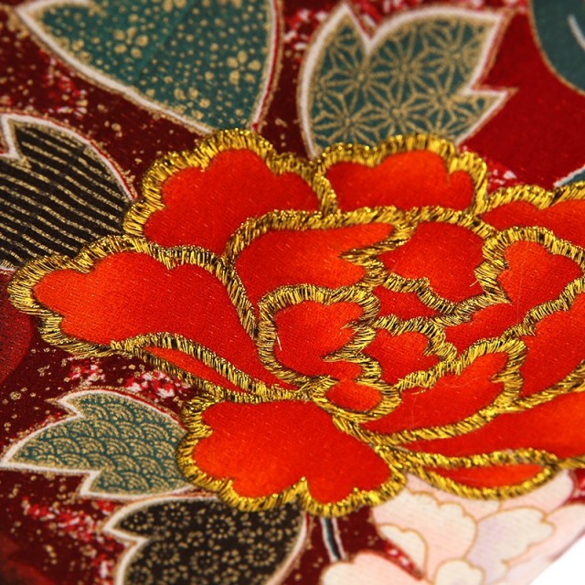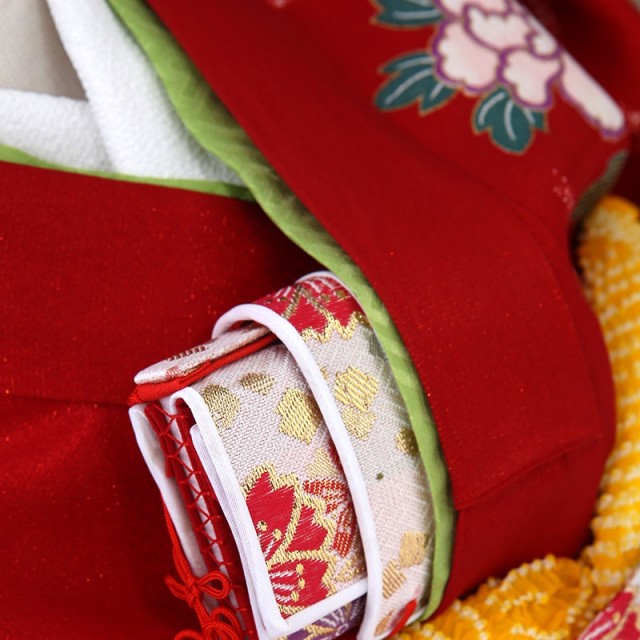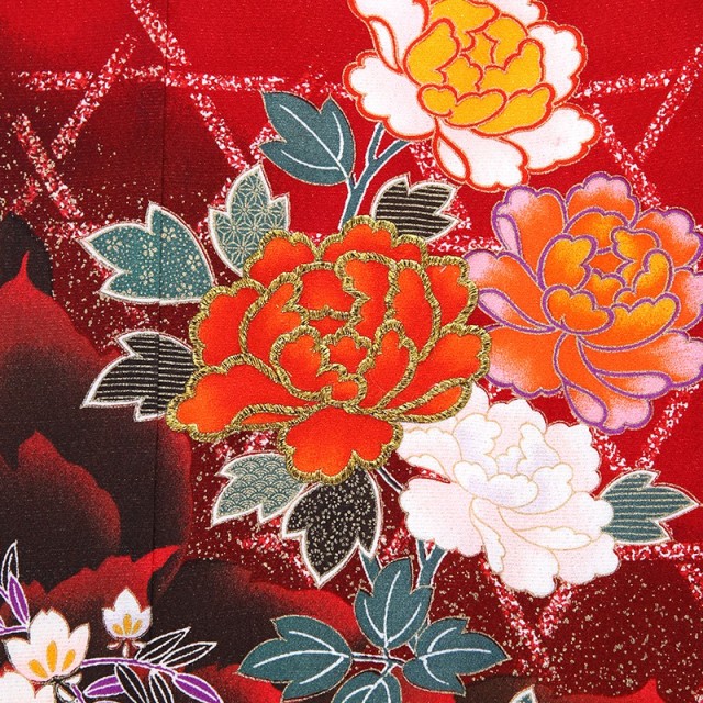 女の子着物の王道と言えば、赤色をイメージする方が多いのではないでしょうか。気品がある鮮やかな色が目を惹きつけます。「赤色」には、昔から厄除けの意味があり、この先も素敵な人生を歩めるようお守りのような役割があります。また赤は神聖な色とされ、一般の人々が着用を許されなかった時代もあり、憧れが強い色でもありました。このようなところから格調の高さや凛とした強さを感じます。そして王道の赤には、伝統的な吉祥文様が合い、古典的で正統派な装いに仕上がりました。豪華に描かれる「牡丹」。たくさんの花弁があり、「百花の王」と呼ばれ、富貴、高貴、幸福を表しています。花の文様は、女性らしく華やかな印象を与えます。最も記憶に残る色とされている赤の着物に、縁起のいい美しい花が描かれるこちらの着物。正式なイベントには、やはり正統派着物を着たい方におすすめします。伝統的な装いをすることで、普段感じることのない素晴らしい日本文化を実感できます。また着物の色や文様の意味を知り、お祝いの気持ちや、これからの願いを着物に重ねてみると、忘れられない一着になるでしょう。