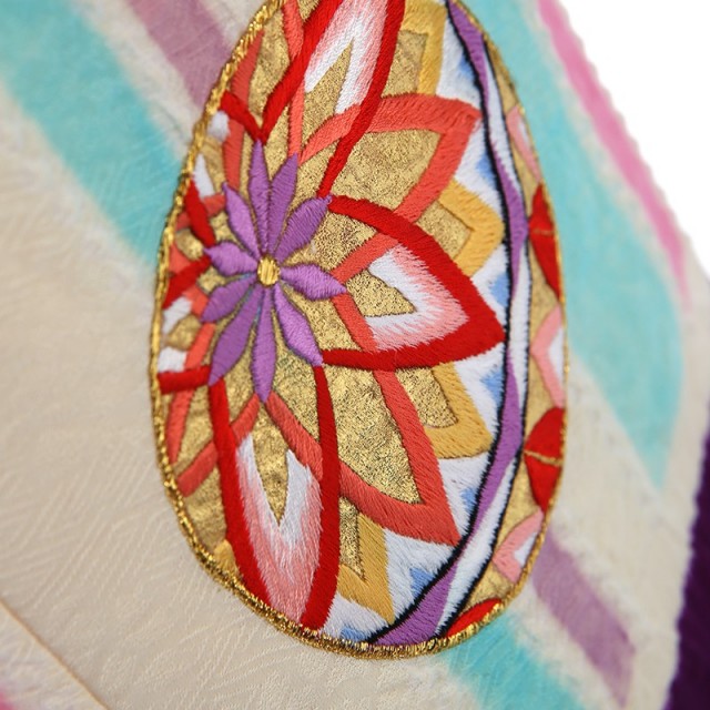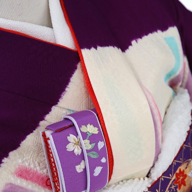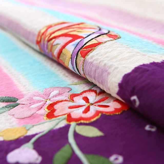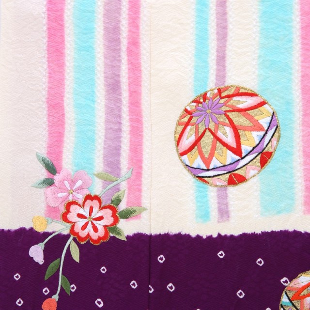 着物地は「京紫」と呼ばれる、赤みがかった美しい紫。古くから都であった京都で染められ、優雅さを感じる上品な色味になります。そこに大胆に描かれるストライプ柄。「滝縞文様」という、太い筋から細い筋になっている縞文様で、縞の連続が滝のように見えることから名付けられました。直線は厄除けの意味があります。淡い色彩で描かれているので個性的すぎずに優しい印象を与えます。そして縁起のいい吉祥文様が一緒に描かれており、「手毬」は平安時代貴族の遊びだったことから高貴さを表しています。また丸い形状から、何事も丸く収まるようにと願いが込められている文様です。「桜」は、季節の始まりに咲くことから新しい門出や物語の始まりを意味します。また一斉に咲き誇る姿から繁栄を表しています。春の季節になると日本中を華やかにしてくれる、日本人にとって特別な花と言えるでしょう。着物の裾には「鹿の子絞り」が装飾され、繊細さが非常に上品で更に豪華さを与えてくれます。古典的で品のある装いですが、その中にも個性が光る魅力的な一着に仕上がりました。おめでたい文様と伝統的な色彩は、格式のある行事に相応しいでしょう。