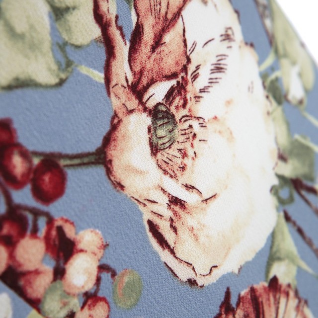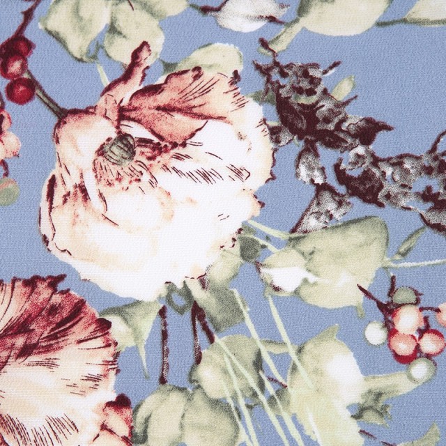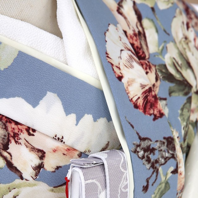 着物地は落ち着いたグレイッシュカラー。「青藤(あおふじ)」という、青がかった藤色で、平安時代から女性に愛された伝統色です。控えめな美しさがあり、上品で大人っぽい印象を与えます。そこに豪華な花々が描かれています。大輪の「牡丹」は、たくさんの花弁があり「百花の王」と呼ばれ、富貴、高貴、幸福を表しています。白い「アネモネ」の花には、希望、期待という意味があります。これからの人生、希望に満ち溢れた幼い子の大切な晴れの日に相応しい文様です。木の実や葉っぱと一緒に華やかに描かれており、西洋の文化を感じさせるタッチが美しく、まるで絵画のように仕上がっています。洋風なイメージですが、描かれる花には大切な意味が込められているので特別な日に是非おすすめしたい一着です。大人の着物のような格調の高さを感じさせ、いつものあどけない姿とは違った凛とした姿を見ていただけるでしょう。華やぐ装いで、お子様の健やかな成長と幸福を願い、素晴らしい一日になりますように。