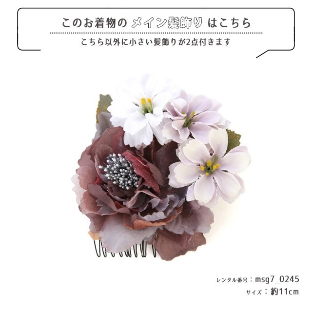 | コーディネート | 女の子七五三(7歳女の子用)に含まれる物:着物、長襦袢(カット袖)、作り帯、草履、バッグ、帯揚げ、箱迫、帯〆、しごき、末広(扇子)、足袋、腰紐(3本)、コーリンベルト、伊達締め、髪飾り |