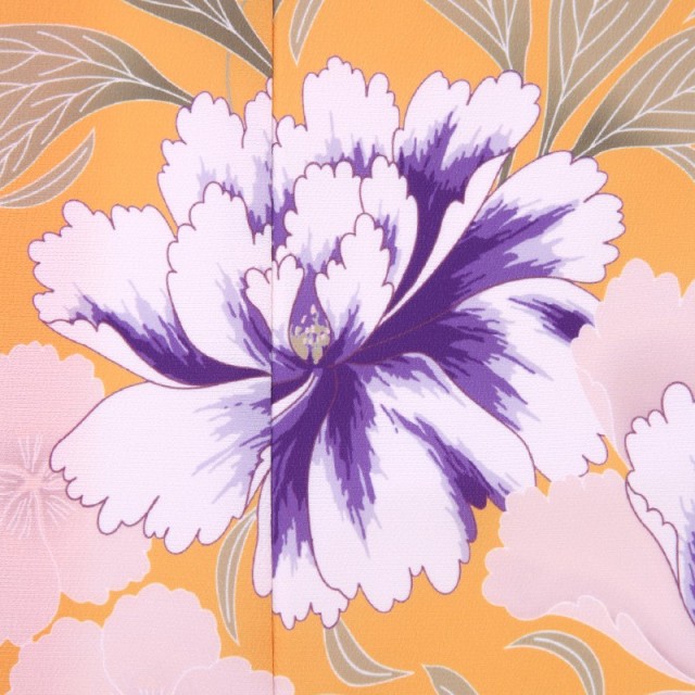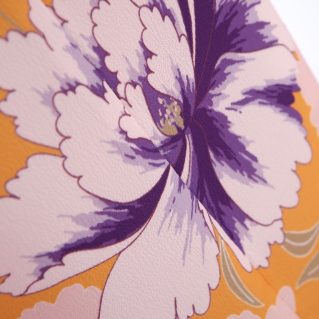 鮮やかなオレンジは「山吹色」と呼ばれる、山吹の花のような赤みのある黄色のことです。平安時代より親しまれてきた古くから伝わる色味で、黄金に似ていることから「黄金色」とも呼ばれています。そこに大輪の「牡丹」が描かれます。美しい牡丹は「百花の王」とされ、古くから幸福や富貴の象徴として描かれてきました。また不老不死、不老長寿という意味も込められています。そして紺の羽織に描かれる「花丸紋」。丸紋は始まりも終わりもないことから永遠に続く幸福を表しています。また「円=縁」を連想され、ご縁に恵まれるようにと願いがこもった縁起のいい文様です。可愛らしい草花の文様と描くことによって、より華やかに。丸みのある形が愛らしい「橘」は、長寿や子宝の願いが込められています。一度しかない大切なお祝いの装い。家族の願いや気持ちに寄り添ってくれるこちらの着物。古典柄が美しく、明るい色使いで、晴れやかな気持ちにしてくれるでしょう。