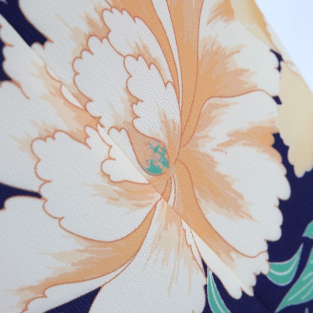 古典的、でもどこかモダンな印象もあります。着物地は「瑠璃紺(るりこん)」と呼ばれ、瑠璃色がかった紺色です。深い紫みのある青色で、上品さがあります。今の時代には珍しい青の着物ですが、文様はよく映えて非常に華やかで豪華。描かれる文様は、大輪の花「牡丹」です。「百花の王」とされ、古くから幸福や富貴の象徴として描かれてきました。また不老不死、不老長寿という意味も込められています。その上に合わせる白い羽織には、「花丸紋」が描かれます。丸紋は始まりも終わりもないことから永遠に続く幸福を表しています。また「円=縁」を連想され、ご縁に恵まれ繋がっていきますようにとの願いがこもった縁起のいい文様です。丸みのある形が愛らしい「橘」は、長寿や子宝の願いが込められています。濃い色の着物は顔がはっきり明るく映えますので、撮影の多いシーンにぴったりです。伝統的な色彩と文様を使用し、王道さもありながら、個性的でおしゃれな印象も与える魅力的な装いです。