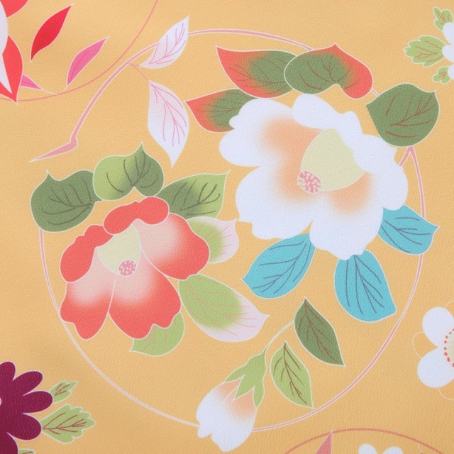 お祝いの気持ちを表したような、鮮やかな色合わせに惚れ惚れします。着物地の「赤色」は、古くより厄除けの色とされてきました。また太陽の色と似ているとされ、恵みの象徴だったことから、生命力や活力を表します。凛とした美しさがある赤の着物に、明るい色の羽織を重ねることで更に華やかに。羽織の色は「山吹色」と呼び、山吹の花のような赤みのある黄色。古くから伝わる伝統色で、黄金に似ていることから「黄金色」とも呼ばれています。そしておめでたい吉祥文様が沢山描かれます。大輪の花は「牡丹」。「百花の王」とされ幸福や富貴の象徴とされています。また不老不死、長寿という意味も込められています。羽織には「花丸紋」が描かれ、丸紋は始まりも終わりもないことから永遠に続く幸福を表しています。また「円=縁」を連想され、ご縁に恵まれますようにと願いがこもった文様です。丸くて可愛い「橘」は、長寿や子宝の願いが込められます。未来の願いに寄り添ったこちらの着物。古典柄で日本の伝統を感じますが、女の子らしい愛らしさもあり、特別な一着に仕上がりました。