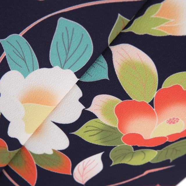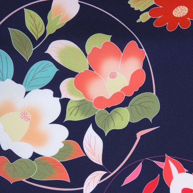紺色の着物は、上品で格調の高さがあります。文様もよく映え、浮かび上がるような立体感を感じさせます。描かれるのは「花丸紋」。丸紋は始まりも終わりもないことから永遠に続く幸福を表しています。また「円=縁」を連想され、ご縁に恵まれるようにという願いが込められています。一緒に描かれる草花も美しく「椿」は文字通り春に咲く花で縁起がよく、「橘」は長寿や子宝の願いが込められます。羽織は、淡い色彩で柔らかさが大人っぽく、紺の着物に羽織ることで優しい雰囲気を出してくれます。大輪の花は「牡丹」。「百花の王」とされ、幸福や富貴の象徴として描かれます。また不老不死や長寿の意味もあり、古くより縁起のいい文様として親しまれてきました。紺地の着物で古典的で正統派ですが、女の子らしい柔らかさもあり、着ていただきやすいコーディネートです。大人っぽい着姿でお子様の成長を感じ、これからの幸福や健康の願いを込めて、忘れられない一日になりますように。