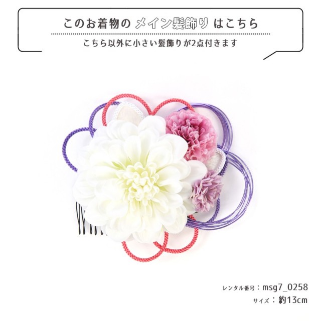 | コーディネート | 女の子七五三(7歳女の子用)に含まれる物:羽織、着物、長襦袢(カット袖)、作り帯、草履、バッグ、帯揚げ、箱迫、帯〆、末広(扇子)、足袋、腰紐(3本)、コーリンベルト、伊達締め、髪飾り |