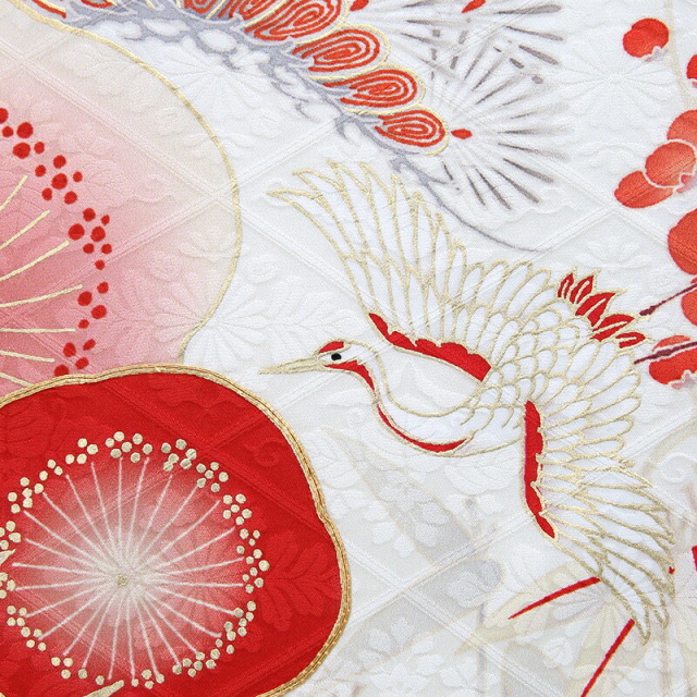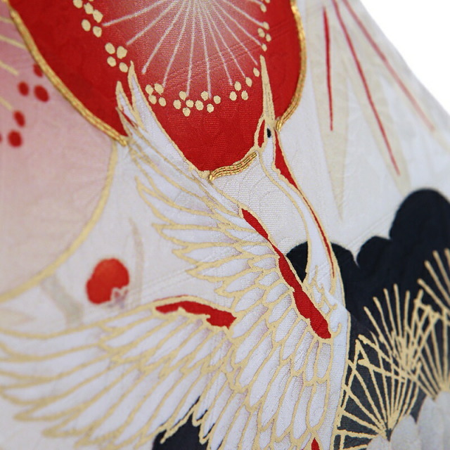 これぞ晴れ着、これぞ女の子着物。溢れるほどにおめでたい文様が描かれた正統派な古典着物です。白地の着物に赤色がよく映えて、紅白でおめでたい色合わせになっています。描かれる「松」は1年中美しい緑を保ち続け、「竹」は雪にも負けず真っすぐに伸び続け、「梅」は寒い冬が終わるといち早く香り高い花を咲かすことから「松竹梅」は、逆境に負けない力強さ、生命力を表しています。「鶴」は、古くから神の鳥と考えられてきました。「鶴は千年、亀は万年」と呼ばれることから長寿の象徴とされています。そして純白の羽で大空を飛ぶ気高い姿は美しく、高貴で誇り高き文様として描かれています。可愛さ満開、幸せ満開、大切な意味が込められた王道を好まれる方におすすめしたい特別な一着です。