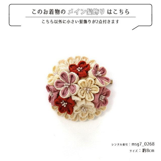 | コーディネート | 女の子七五三(7歳女の子用)に含まれる物:着物、長襦袢(カット袖)、作り帯、草履、バッグ、帯揚げ、箱迫、帯〆、しごき、末広(扇子)、足袋、腰紐(3本)、コーリンベルト、伊達締め、髪飾り |