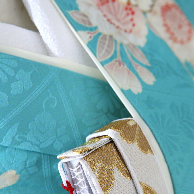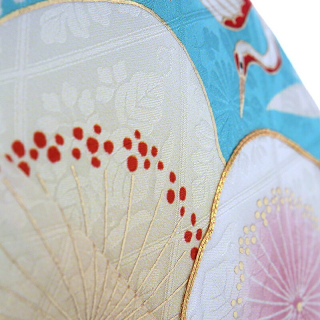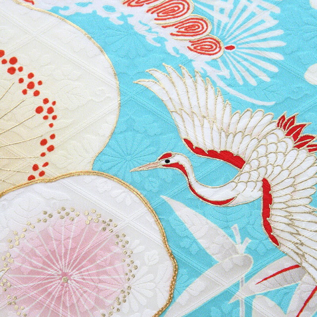 爽やかで気持ちが明るくなる幸せいっぱいのお祝い着の紹介です。着物地の鮮やかな色は「水縹(みはなだ)」と呼ばれ、藍染の薄い色で明るい青色を指します。万葉集にも記載がされている非常に古い伝統色です。文様もおめでたい意味が込められた吉祥文様が沢山描かれます。「松」は1年中美しい緑を保ち続け、「竹」は雪にも負けず真っすぐに伸び続け、「梅」は寒い冬が終わるといち早く香り高い花を咲かすことから「松竹梅」は、逆境に負けない力強さ、生命力を表しています。「鶴」は、古くから神の鳥と考えられてきました。「鶴は千年、亀は万年」と呼ばれることから長寿の象徴とされています。そして純白の羽で大空を飛ぶ気高い姿は美しく、高貴で誇り高き文様として描かれています。色彩も描かれる文様も、古来受け継がれてきた日本の伝統と格式を誇るものばかりで、正統派な一着に仕上がっています。