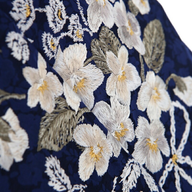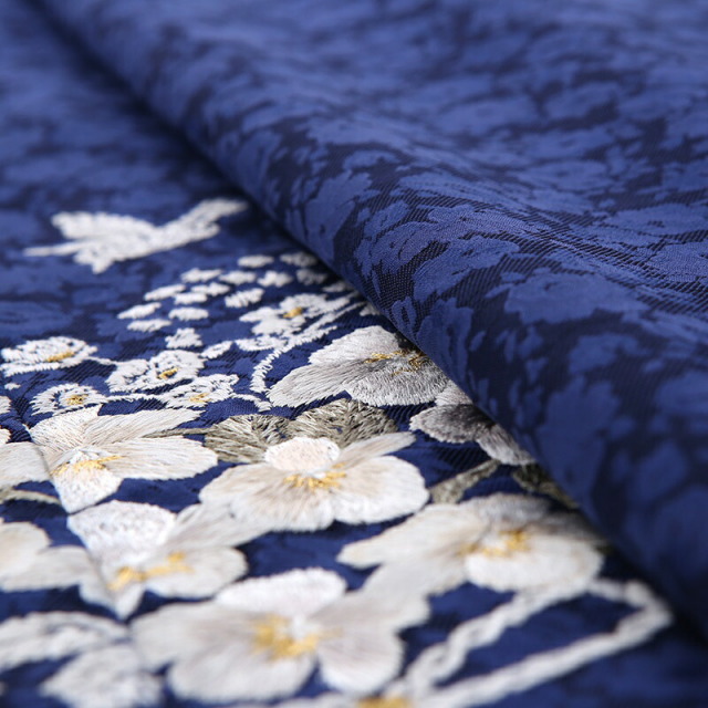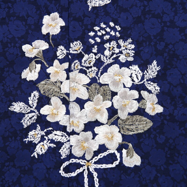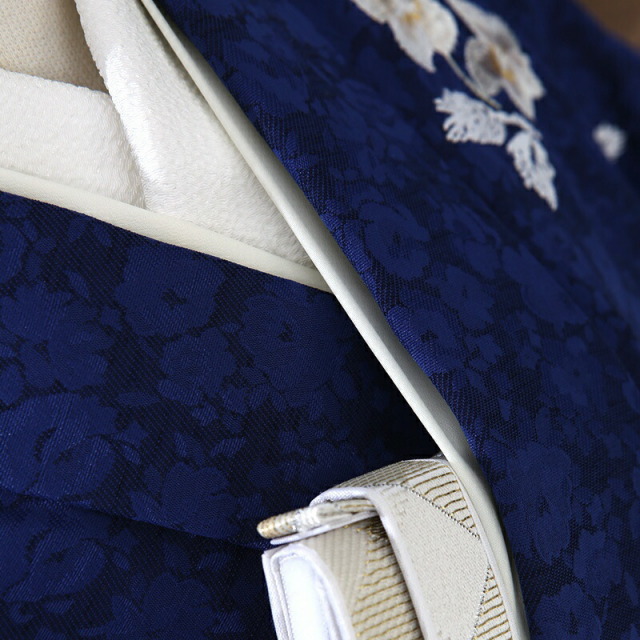 しっとりとした紺色の着物地は格調の高さを感じさせます。こちらの紺色は「金青(こんじょう)」と呼ばれ、古代の顔料の色で紫色を帯びた暗い上品な青色のことです。非常に古い伝統色で、仏像や仏画の彩色になくてはならないもので、貴重な顔料とされてきました。着物の地紋にも小花が描かれ、繊細で丁寧に作られています。描かれる文様は可愛らしいブーケ。凛とした雰囲気の着物ですが、ブーケを描くことで優しさや柔らかさも感じます。色彩はシックな色味ですが、決して地味になることなく非常に洗練された美しさがあり、華やかな装いに仕上がりました。大人っぽいコーディネートで大きな成長を感じるのではないでしょうか。忘れられない一日をお過ごしください。