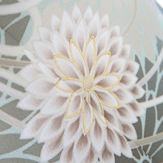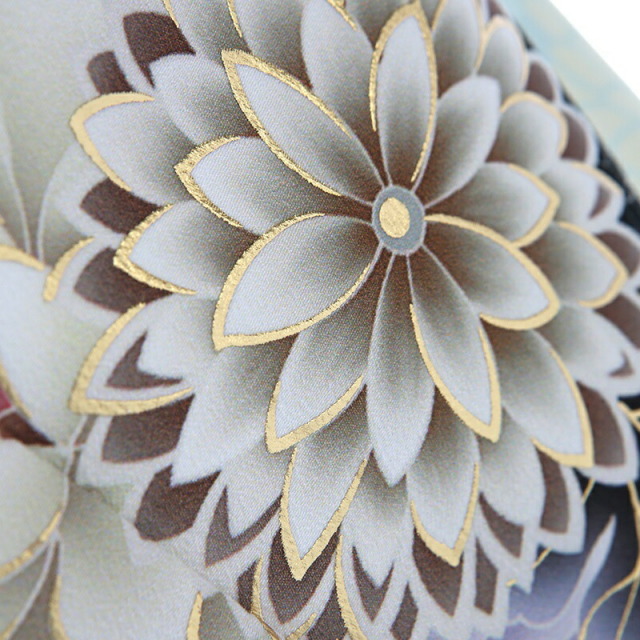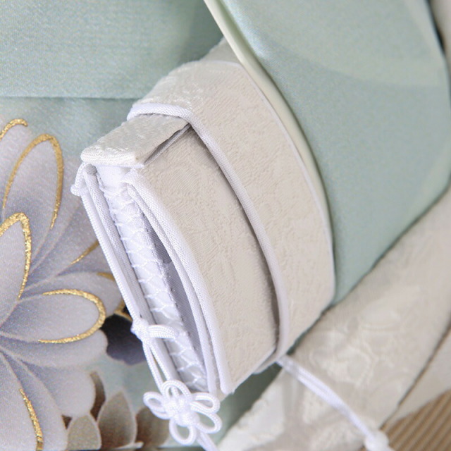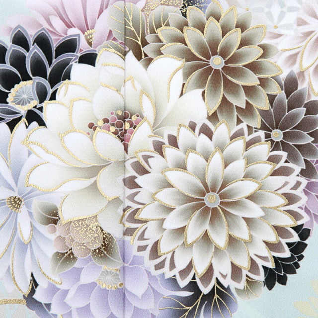 優しくふんわりした着物の色は「薄水色(うすみずいろ)」と呼ばれる伝統色。文字通り水色を薄くしたような、淡い青緑色のことです。爽やかで清楚な色味が魅力です。その上に華やかに描かている「菊」は、太陽の形に似ていることから、最も位の高い花とされてきました。長寿や不老不死の意味も込められます。その菊を使って「薬玉」が描かれています。薬玉は源氏物語にも登場し、歴史が古く、元々は端午の節句に魔除けとして飾られたもの。薬草である菖蒲や蓮の花を編んで玉を作り、5色の糸を通して飾っていました。女の子のお祝い着では色彩豊かに花々が描かれ、5色の糸がリボン状にデザインされていて、まるで可愛いブーケのよう。不浄を払い邪気を避け、長寿を願う意味が込められた縁起のいい文様です。文様に大切な想いを託せる、日本ならではの伝統的な装いに仕上がっています。